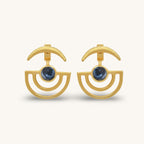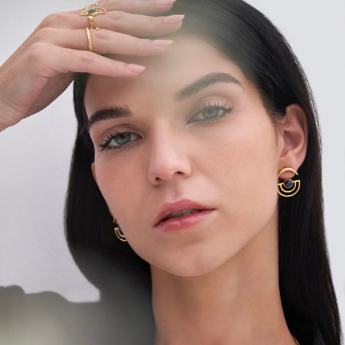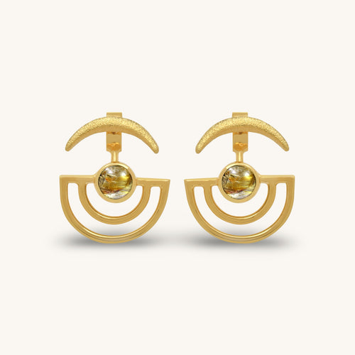 Aretes en dos partes: una luna con textura diamantada que va por la parte frontal de la oreja y un sistema solar con piedra que abraza la oreja y cuelga. Elaborados artesanalmente en latón con chapa de oro 22K, con piedra serafinita (verde), cuarzo rutilado (amarillo) o pietersita (azul)