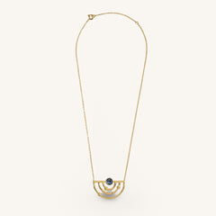 Este collar con dije en forma de sistema solar, adornado con pietersita o serafinita, está inspirado en el dios Vishnu. Simboliza el equilibrio y la protección divina.