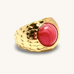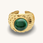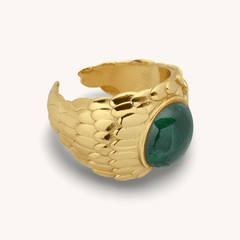 Inspirado en Amaterasu, su textura de granos ancestrales y piedra malaquita o jaspe rosa, captura la esencia del sol y la fertilidad. Su diseño detallado evoca la luz divina y la abundancia. Este anillo no solo destaca por su belleza, sino que también complementa cualquier look con un toque de elegancia mística.
